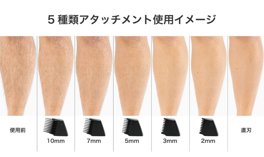 アタッチメントを外してツルツルはもちろん、お好みの刈り高さで必要な毛量だけ残して剃ることもできます。